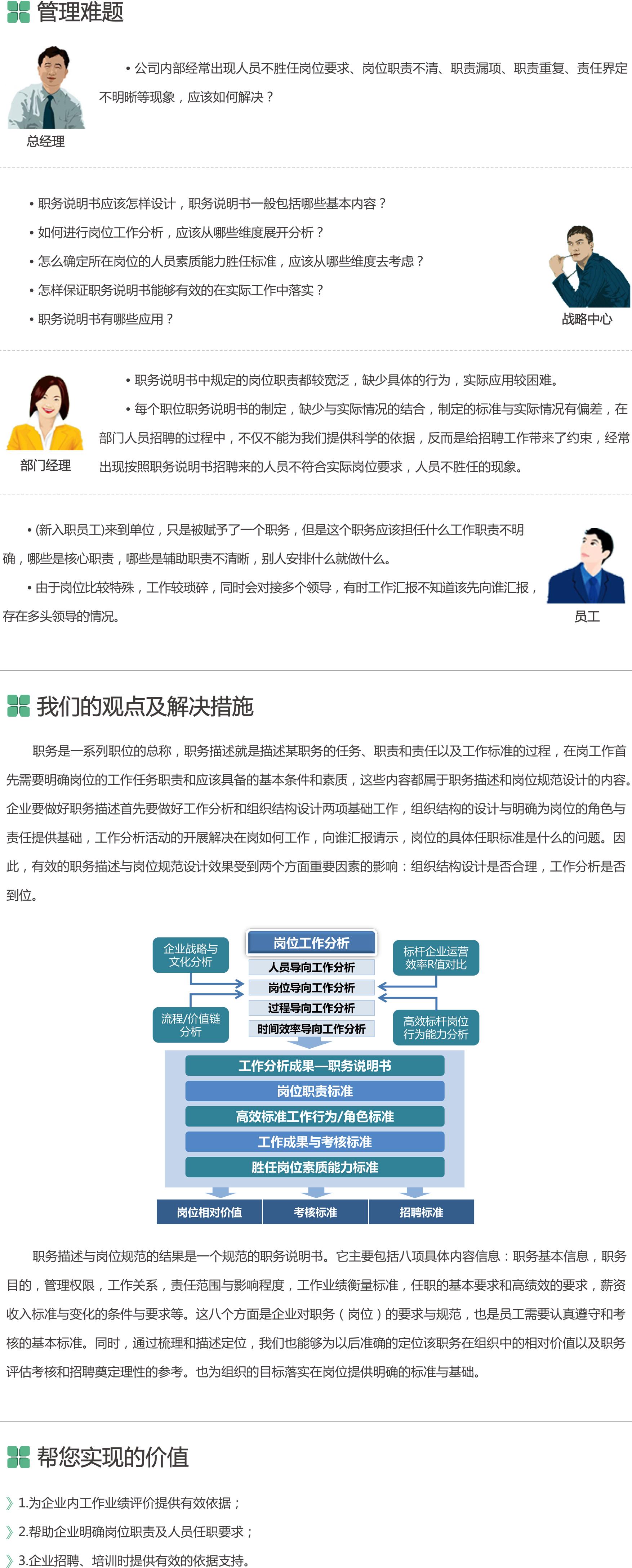 • 每个职位职务说明书的制定,缺少与实际情况的结合,制定的标准与实际情况有偏差,在部门人员招聘的过程中,不仅不能为我们提供科学的依据,反而是给招聘工作带来了约束,经常出现按照职务说明书招聘来的人员不符合实际岗位要求,人员不胜任的现象。