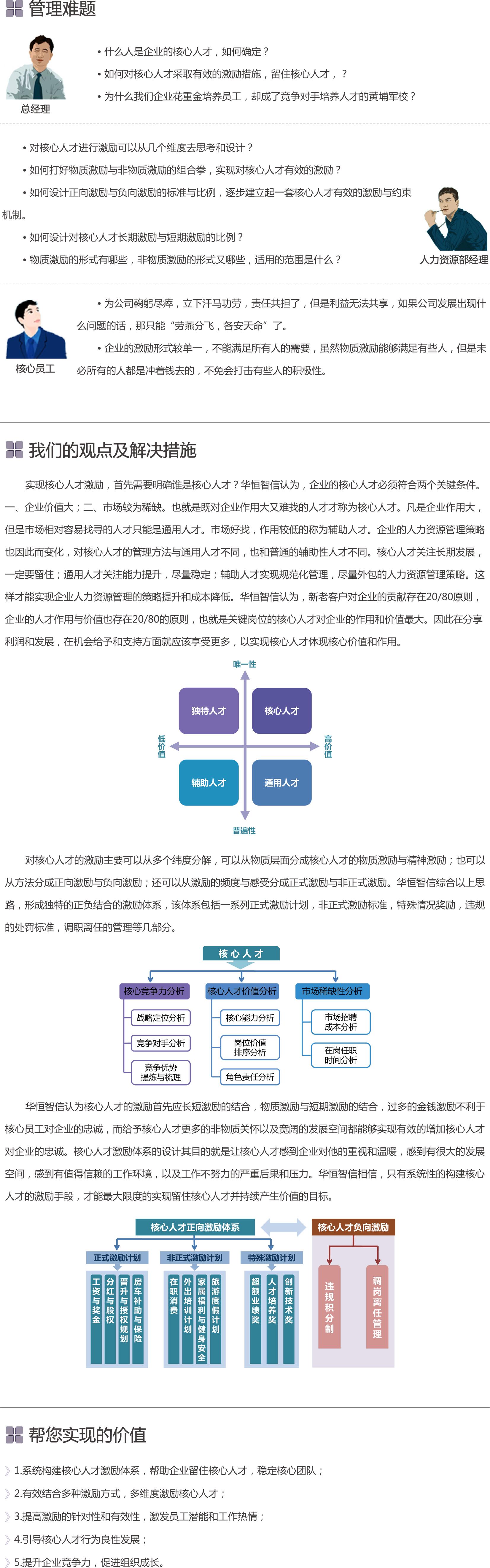 对核心人才的激励主要可以从多个纬度分解,可以从物质层面分成核心人才的物质激励与精神激励;也可以从方法分成正向激励与负向激励;还可以从激励的频度与感受分成正式激励与非正式激励。华恒智信综合以上思路,形成独特的正负结合的激励体系,该体系包括一系列正式激励计划,非正式激励标准,特殊情况奖励,违规的处罚标准,调职离任的管理等几部分。