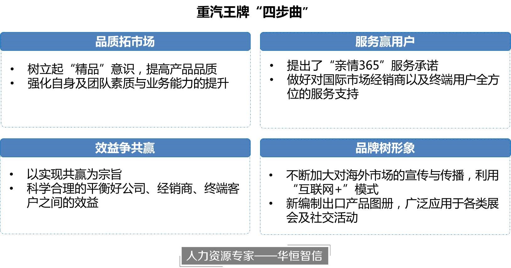 重汽王牌经营管理者认为产品销售量的高低不仅仅只依靠产品品质,同时还需要对用户贴心的服务。重汽王牌秉持“亲情365”服务承诺,不断推进海外市场销售人员对该理念的认可,将母公司文化落实。