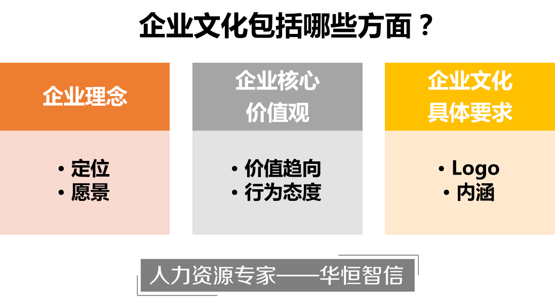 华恒智信认为,不同的企业有不同的企业文化,不同发展阶段企业文化特征也会有所不同,因此企业需要精心设计适合本企业特点的企业文化大纲,以支持其战略目标的实现和核心凝聚力的提升。具体而言,一个切实可行的企业文化主要由三个部分组成: