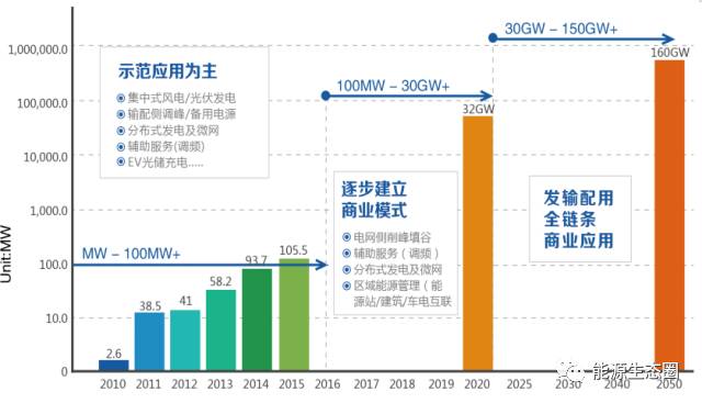 我们从上图可看出,我们的储能电站从2010年到2015年期间,大概装机容量有100兆瓦左右。从2016年—2020年预测,可以做到30GW以内;2020年—2050年预测30-150GW的用量。从2016年—2020年,主要在商业领域、工业领域应用较多;从2020年—2050年,是发输配全产链的应用。