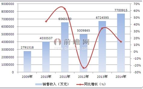 2009-2014年中国风力发电行业销售收入变化情况(单位:万元,%)