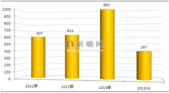 2013年风电建设完成投资额有所回升,为631亿元。2014年风电建设完成投资额大幅增长,为993亿元,已超过到2011年的水平。2015年上半年,我国完成风电建设投资397亿元,同比增加43.7%。