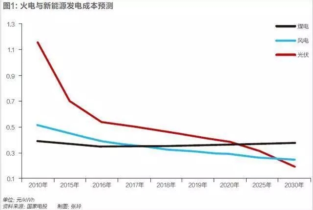 近年来,风、光发电的技术进步很快。单体风机的功率不断增大,适应低风速发电的风机已推广应用,太阳能电池和组件的转换效率持续改进。与此同时,新能源的发电成本也在快速下降。风电设备和光伏组件的价格,在过去的五年里下降幅度分别超过了20%和60%。美国风电长期购电协议价格已与化石能源发电达到同等水平,德国新增的新能源电力基本实现与传统能源平价。我国部分地区新能源的价格已经与煤电价格相当,预计到2030年,光伏发电成本可以达到0.2元/千瓦时,风电达到0.22元/千瓦时(见图表1)。