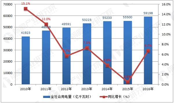 随着中国经济持续快速增长,用电需求迅速增长。据前瞻产业研究院发布的《断路器行业市场前瞻与投资战略规划分析报告》数据显示,全社会用电量自2010年的41923亿千瓦时增长到2016年的59198亿千瓦时,年复合增长率达5.92%。