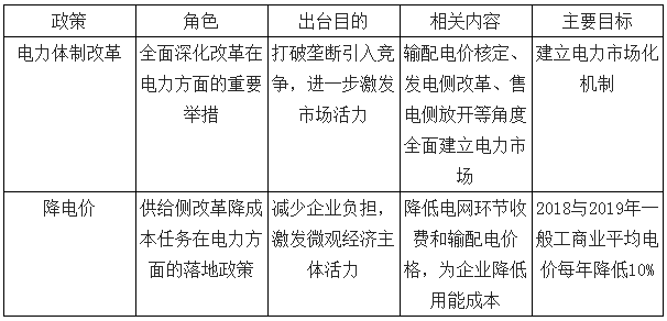 电力体制与降电价政策成为我国激发市场活力在电力方面的对应政策。在我国经济进入新常态后,政府坚持全面深化改革,保持经济社会活力。在电力体制改革方面,国务院在2002年颁布了《电力体制改革方案》(“电改5号文”),2015年又颁布了《电力体制改革的若干意见》(“电改9号文”),力求建立电力市场化机制,从输配电价核定、发电侧改革、售电侧放开等角度全面建立电力市场,打破垄断引入竞争,进一步激发市场活力。