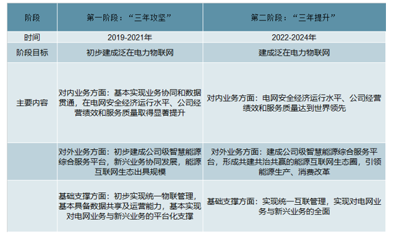 2019年1月,国家电网在其2019年“两会”上提出了“三型两网、世界一流”的战略目标,加快向能源互联网企业转型升级。打造“三型”企业是公司实现“建设世界一流能源互联网企业”这一战略目标的重要抓手,“三型”包括“枢纽型、平台型、共享型”。“枢纽型”指“在能源汇集传输和转换利用中的枢纽作用”;“平台型”指“以能源互联网为支撑,打造能源配置平台、综合服务平台和新业务、新业态、新模式发展平台”;“共享型”指“积极有序推进投资和市场开放,打造共建共治共赢的能源互联网生态圈”。建设运营好“坚强智能电网”和“泛在电力物联网”的“两网”被作为实现这一战略目标的物质基础。