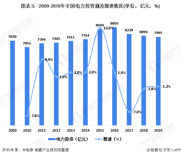 近十年,我国电力行业年投资额呈波动趋势,且自2017年起,电力投资额连续三年呈负增长。2019年我国电力投资额为7995亿元,同比下降1.2%。