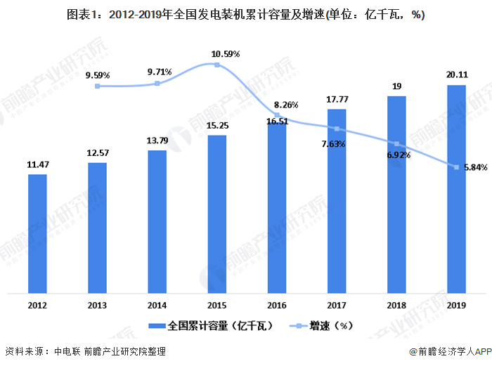 近年来,我国发电装机容量不断提高,并且一直保持着增长趋势,2012-2019年,我国发电装机累计容量从11.47亿千瓦增长到20.11千瓦。但2015年之后,装机容量增速呈下降趋势,2019年我国装机容量同比增速为5.84%。
