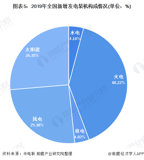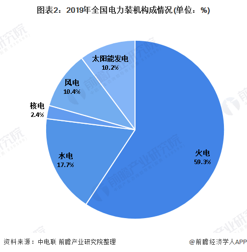 2019年,在全国发电装机容量中,火电装机11.91亿千瓦,占总装机容量的59.2%;水电装机3.56亿千瓦,占总装机容量的17.7%;核电、风电和太阳能装机容量分比为4874万千瓦、2.1亿千瓦和2.05亿千瓦。清洁能源装机总容量已经达到8.20亿千瓦,占总装机容量的40.8%。