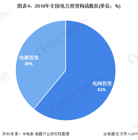 2019年,在全国电力投资构成中,电网侧投资占比61%,电源侧投资占比39%。其中全国电网工程建设完成投资4856亿元,其中110千伏及以下电网投资占电网投资的比重为63.3%,比2018年提高5.9个百分点。