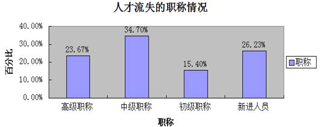 根据相关数据分析显示:宁夏送变电工程公司人才流失主要集中在具有中高级职称的员工群体,总共占人才流失的58.37%。同时,新进人员的流失率所占比例也不低,达26.23%。具有高职称高学历和丰富实践经验的人才流失比例相对比较高,而职称较低或没有职称的员工流失率相对比较低,他们的外流资本较小,因此这一群体相对来说比较稳定。外流人员职称的高低与他们的流失趋势高低成正比的。宁夏送变电工程公司人才流失还将面临的一个挑战是:当没有职称或职称较低的员工通过自己的努力获得高的职称,也有可能选择离职。