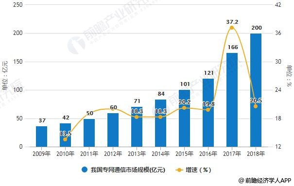 受益于国家对政府与公共安全的重视,以及我国经济快速发展带来的大型活动增加,我国专网通信市场近年来一直保持较快增长。据前瞻产业研究院发布的《中国专网通信行业发展前景预测与投资战略规划分析报告》统计数据显示,2009年我国专网通信市场规模仅达37亿元,之后市场规模呈现逐年增长态势,2015年我国专网通信市场规模突破百亿元。到了2016年我国专网通信市场规模达到了121亿元,同比增长19.8%。截止至2017年我国专网通信市场规模增长至166亿元,同比增长37.2亿%,8年来复合增长率达到20%以上。2018年时我国专网通信市场规模达到200亿元左右。