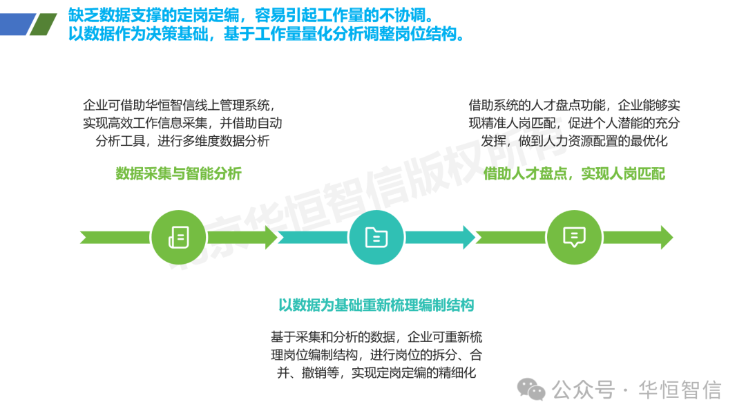 借助华恒智信线上管理系统,企业可实现高效工作信息采集,并进行多维度数据分析;基于采集和分析的数据,企业可重新梳理岗位编制结构,实现定岗定编的精细化;最后,借助系统的人才盘点功能,企业能够实现精准人岗匹配,做到人力资源配置的最优化。