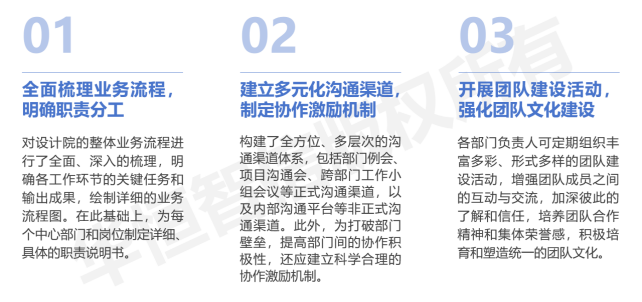 此外,为打破部门壁垒,提高部门间的协作积极性,还应建立科学合理的协作机制。并将团队协作成果纳入绩效考核体系,对在跨部门、部门内部的合作中表现优秀、积极配合的团队和个人,给予对应的物质奖励和精神表彰,激励员工主动参与部门协作,共同为实现设计院的整体目标而努力。