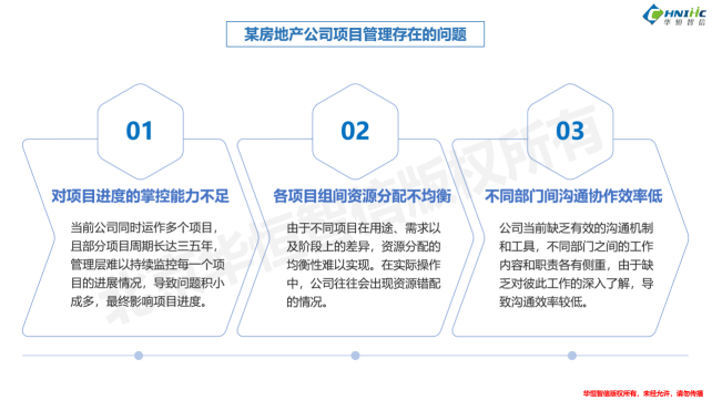 在本案例中,由于项目的数量和复杂度增加,某房地产公司原有的项目管理体系已难以支撑当前的发展,出现了对项目进度的掌控能力不足、各项目组之间资源配置不均衡,以及各部门间的工作协调效率低下等问题。为此,该公司邀请了华恒智信团队,希望能够助力公司实现项目管理的体系优化,以支持公司新发展阶段的管理需求。
