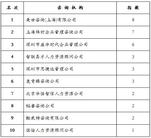 点评:在新一期的榜单中,有三家新上榜机构,他们是:上海纬时企业管理咨询有限公司、北京华恒智信人力资源公司、佐佑人力资源顾问公司;相应落榜的机构是:柏明顿人力资源管理公司、深圳市思捷达管理公司、雅高企业服务中国公司。