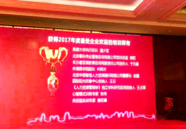2017年11月17日,由国家发改委主管的中国人力资源开发研究会主办的“HRID2017年中国人才发展论坛”在北京隆重召开。会上,华恒智信凭借专业的人力资源团队、优质的客户服务、雄厚的企业实力以及在人力资源咨询领域的卓越贡献,荣获了由中国人力资源开发协会颁发的“2017年度中国企业人才发展服务优秀供应商”这一殊荣,与此同时赵磊老师获得“2017年度最受企业欢迎的培训师”称号。