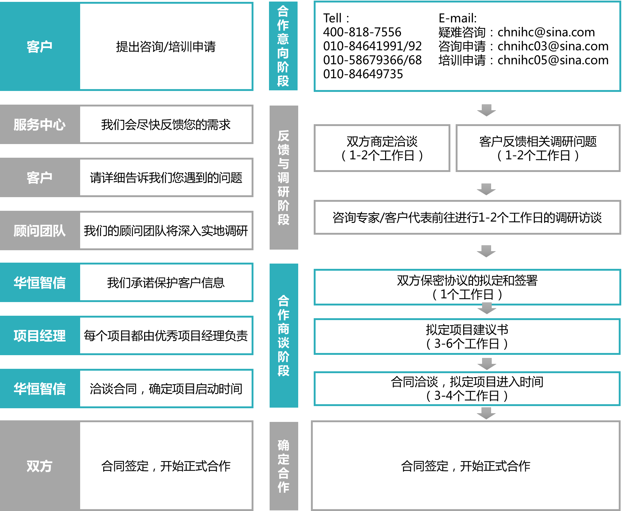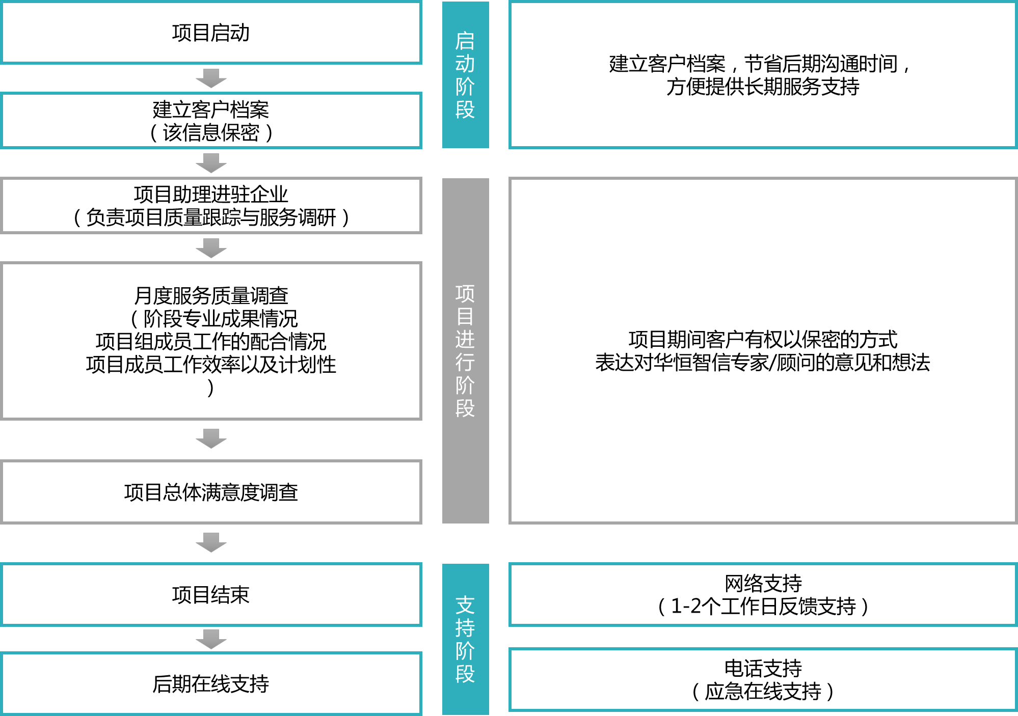 您做为华恒智信的客户,从项目启动的第一天起,华恒智信就在公司安排一名工作助理负责该项目的质量跟踪和服务调研。我们将平均每月进行一次书面的服务质量调查,调查内容涉及:阶段专业成果情况,项目组成员与您工作的配合情况、项目成员工作效率以及计划性,他们的专业技术以及沟通能力等细化成为28项的评价指标,您有权以保密的方式表达您对华恒智信专家/顾问的意见和想法。