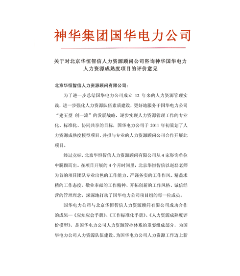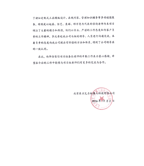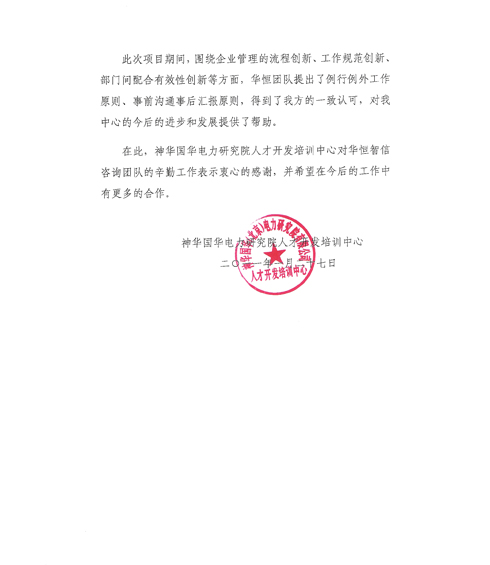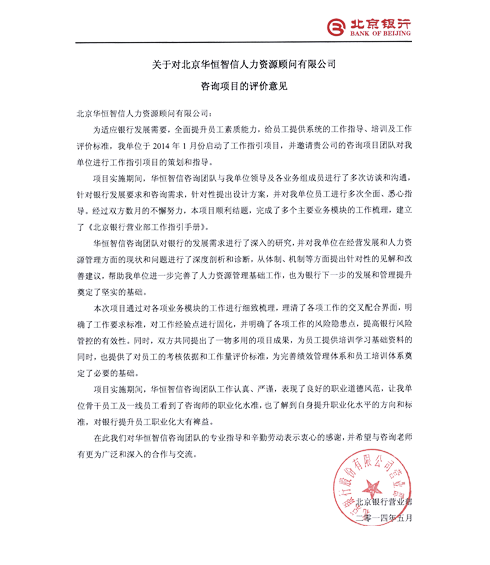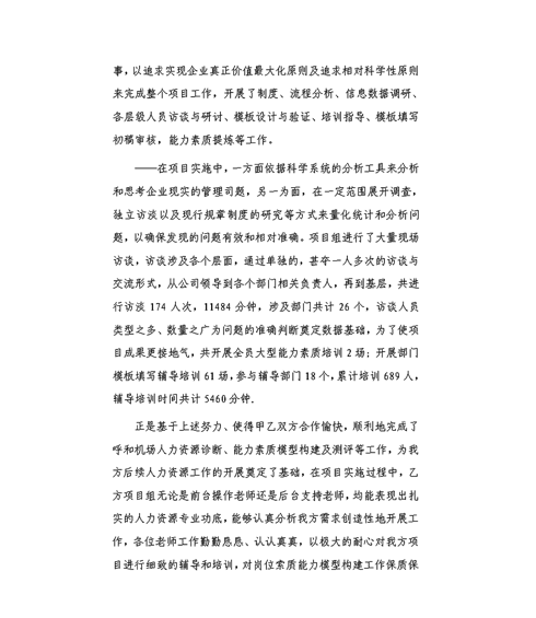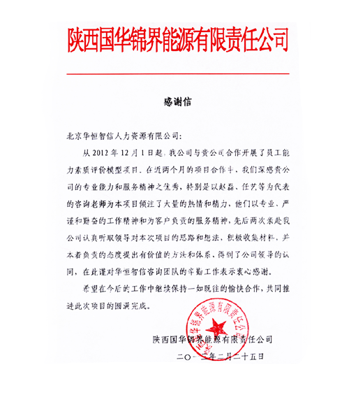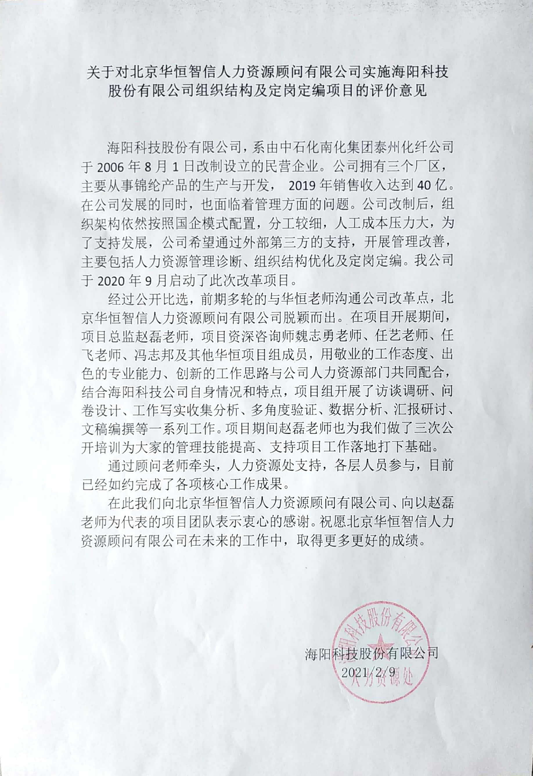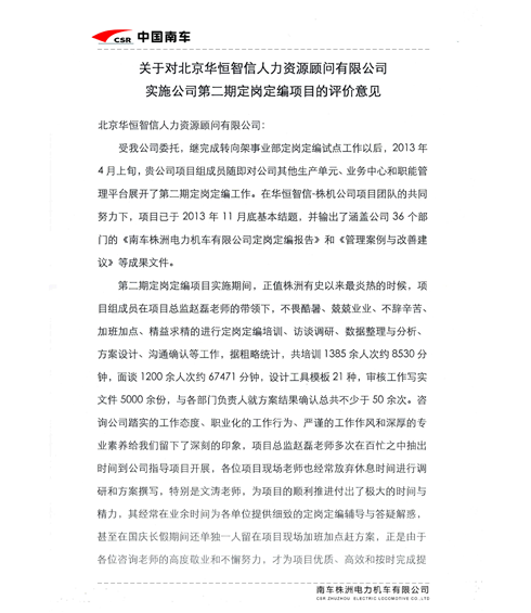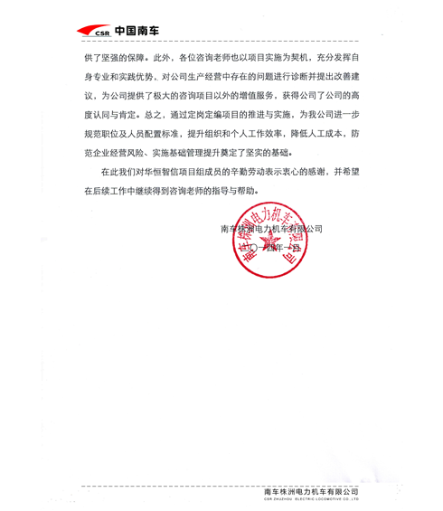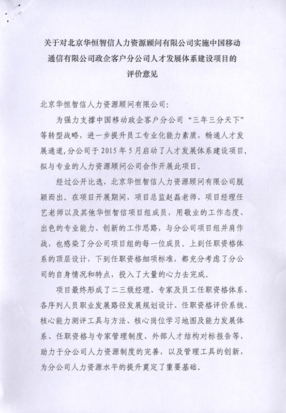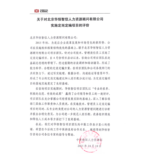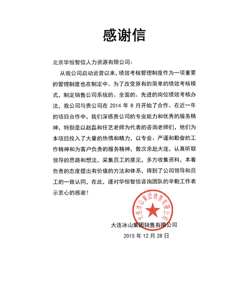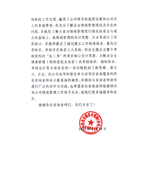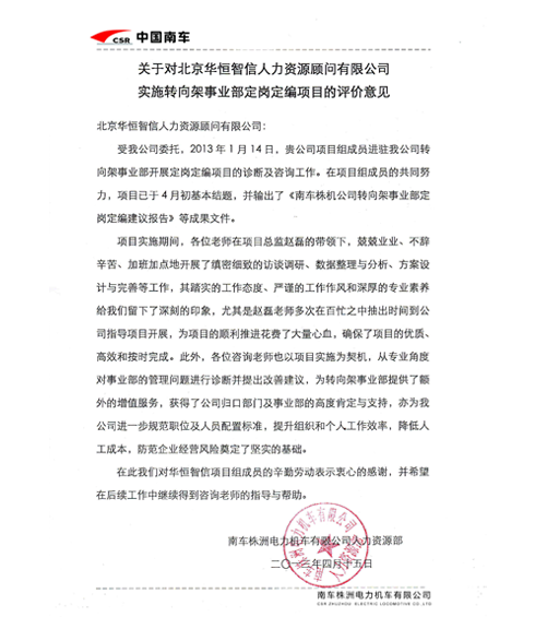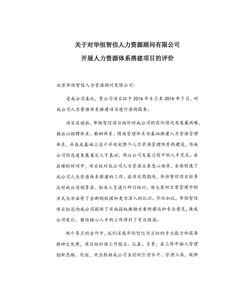 华恒智信顾问团队在合作过程中,多次深入地对我公司进行调研,充分了解我公司中层管理干部竞聘上岗的各项信息,为我公司实现才尽其用、人岗匹配的目标提出了科学合理的思路和方法体系。公司在此对华恒智信咨询团队的辛勤工作表示感谢!...