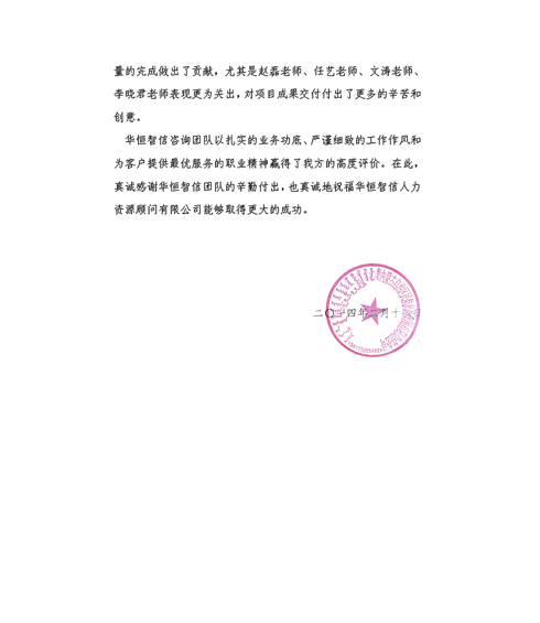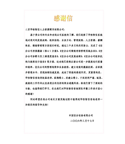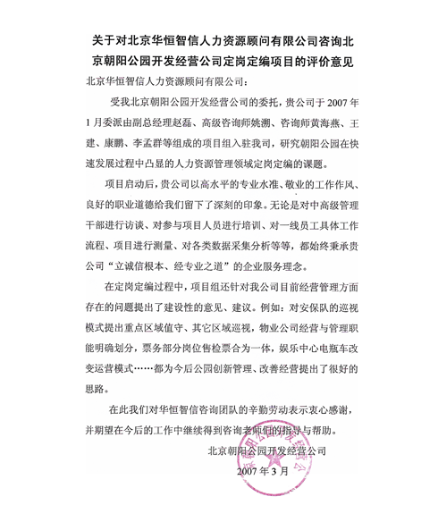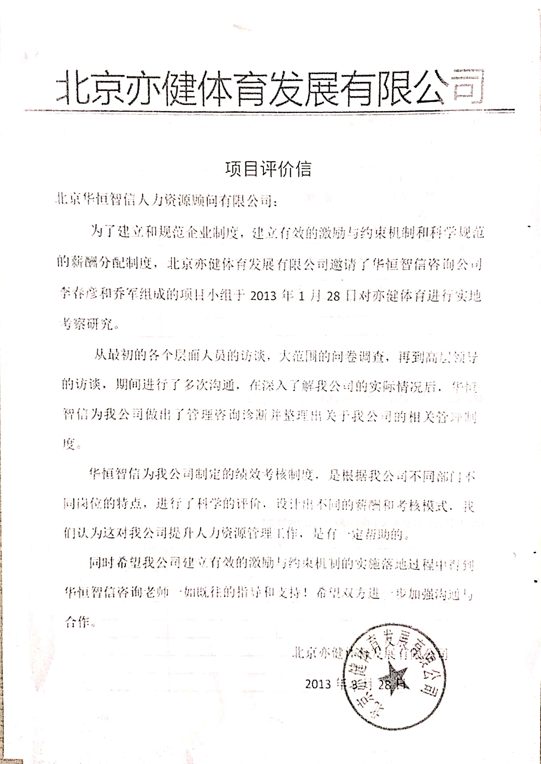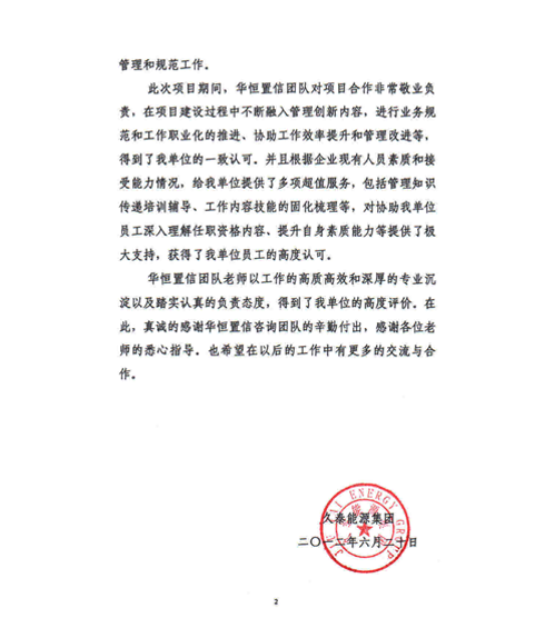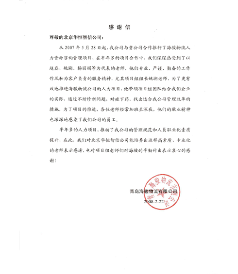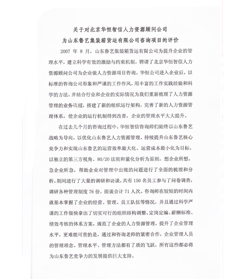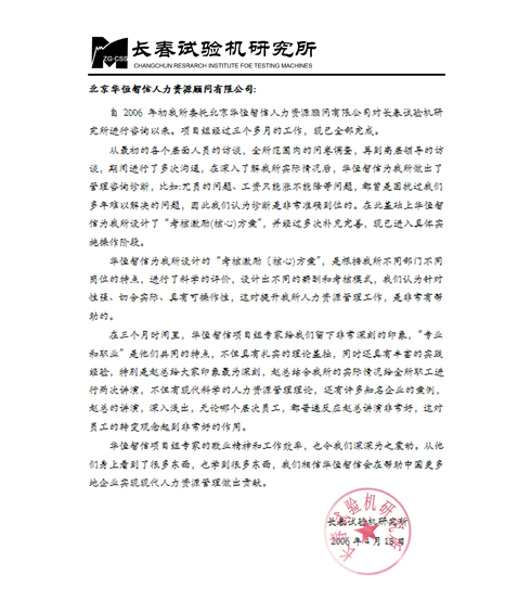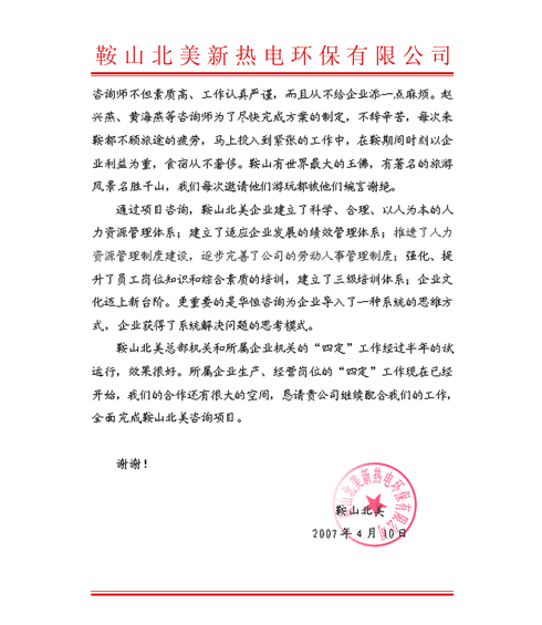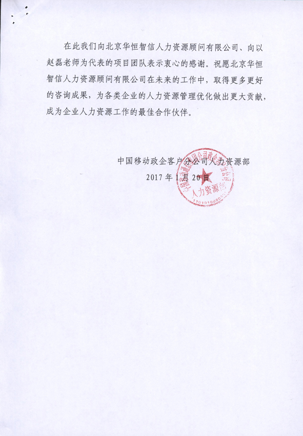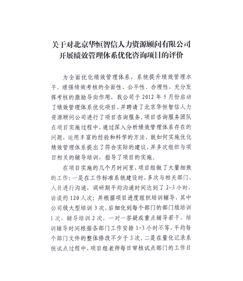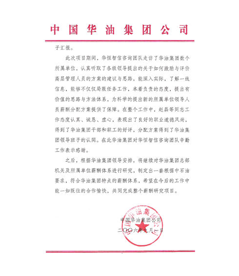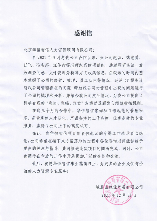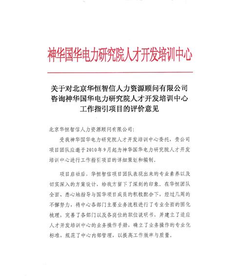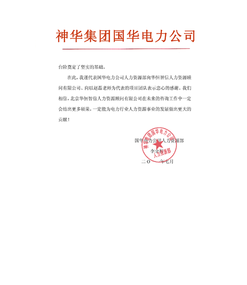 华恒智信顾问团队在合作过程中,多次深入地对我公司进行调研,充分了解我公司中层管理干部竞聘上岗的各项信息,为我公司实现才尽其用、人岗匹配的目标提出了科学合理的思路和方法体系。公司在此对华恒智信咨询团队的辛勤工作表示感谢!...