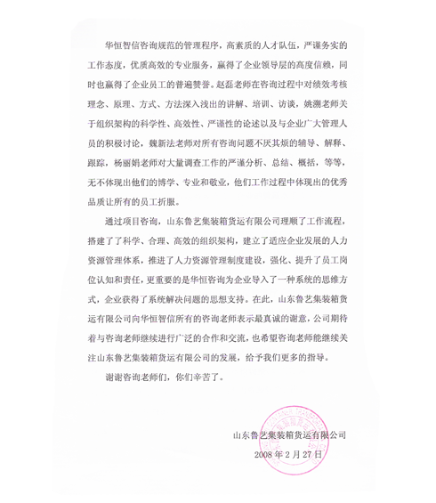 过去公司对人力资源管理一直缺乏重视,企业内部的人力资源管理也十分混乱,随着公司的逐渐壮大,这个问题也一直困扰着我们企业。感谢华恒智信顾问团队为我们设计的人才管理机制,让我们的人才管理更加规范化,相信这样的机制可以帮助我们越走越好,也祝华...