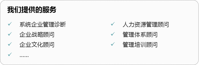 深入、细致的调研,专业性的保障,使得顾问老师能发现了问题产生的根本原因,并能结合实际情况给出很好的解决建议,使各部门在做决策的时候有所考虑,大大减少了不必要的成本。——北京某生物医药企业部门经理