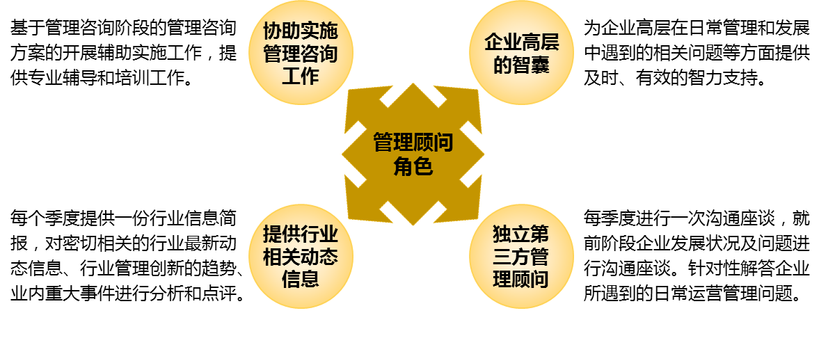 企业高层的智囊:为企业高层在日常管理和发展中遇到的相关问题如发展战略、体制改革、业务收购、投融资活动等重大战略性举措、行业发展信息资讯等方面提供及时、有效的智力支持。