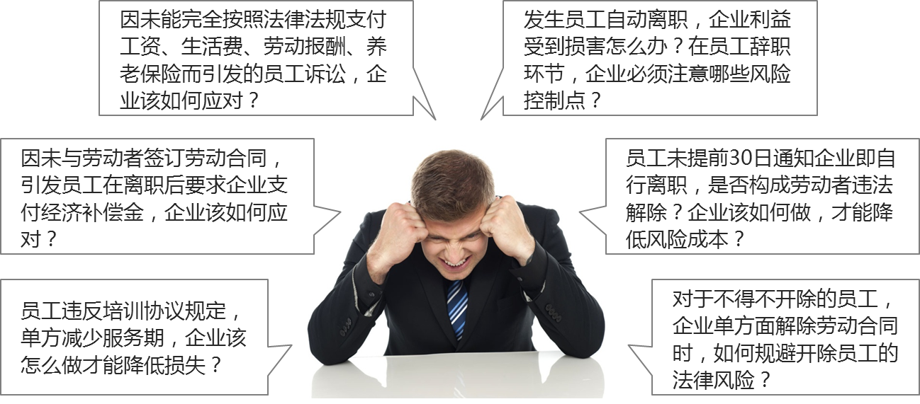 对企业管理者及人力资源管理者进行法律法规的深度解读及宣导培训,结合对经典案例的解读,全面展示解决劳资纠纷或其他法律问题的实例,提高企业管理者对法律事务的重视程度,并帮助企业识别法律风险,搭建风险防范机制。