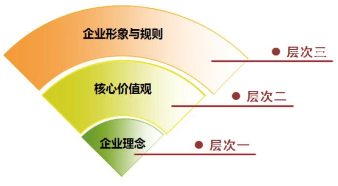 经过多年实践与研究,华恒智信认为一个能够落地的企业文化主要由三个层次组成:第一层面是企业理念,它是企业文化最核心的层面,企业理念也可以被称为企业发展的定位和未来的愿景。第二层面是企业的核心价值观,它是指明确的做事原则,也就是企业对待员工、对待客户、对待工作的准则。其中包含企业规定的员工价值趋向和做事情的行为态度等内容。例如华恒智信对员工提出的“认真、敬业和共享”的价值观就是要求我们的员工在工作中以认真为准则,选人时以敬业为条件,日常工作中要能相互支持与实现信息共享等。还例如,有的企业提出的“以此为生,精于此道”的价值观就是对员工的规范要求和期望。第三层次是企业的形象与标识,其主要包括,企业对外的形象,员工工作时着装/用语等一系列行为形象的规范。例如华恒智信人曾经协助过中国电信提出的“标准着装十八条,标准行为十二条,标准用语五不说”等等。