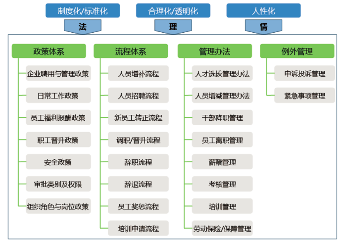 华恒智信相信,先建立“法”,然后通过“理”来支持落实,最后再讲人情,企业的人力资源管理过程才更加有效,也才能更加符合中国式员工的管理特点。