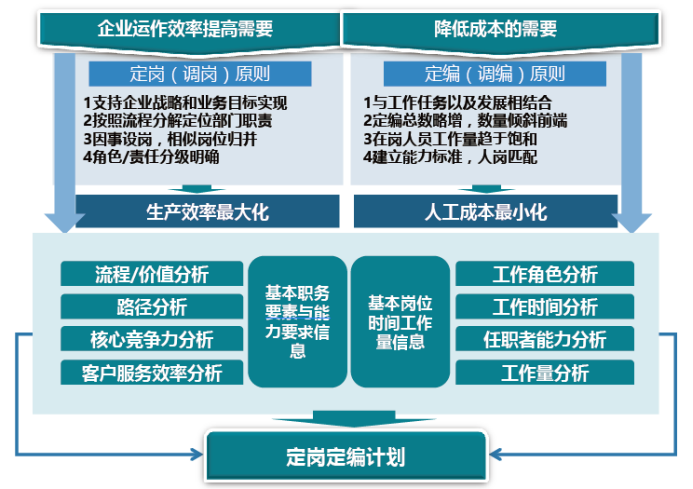华恒智信认为定岗设计的目标就是实现企业运作效率最大化,定编设计的目标是实现人工成本最低化,为了实现这个目标,企业分别要做两个系列的量化分析工作。在岗位设计方面需要进行工作流程/价值链的分析、工作路径的分析、核心竞争力的分析以及服务效率的分析。在编制设计方面进行工作角色的分析,实际工作时间的分析(例如实际完成任务时间和准备时间)、任职者能力分析、工作量等分析工作。这些工作顺利完成之后,可以提出一个对现阶段工作有指导意义的定岗定编计划,其中包含一系列测算公式,以利于企业随着任务的变化而及时调整人数和岗位。