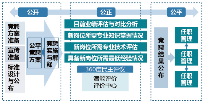 一、竞聘的过程与程序以及标准实现公开公平;二、评价竞聘者时引入一系列专业的评价手段,确保评价结果的公正。