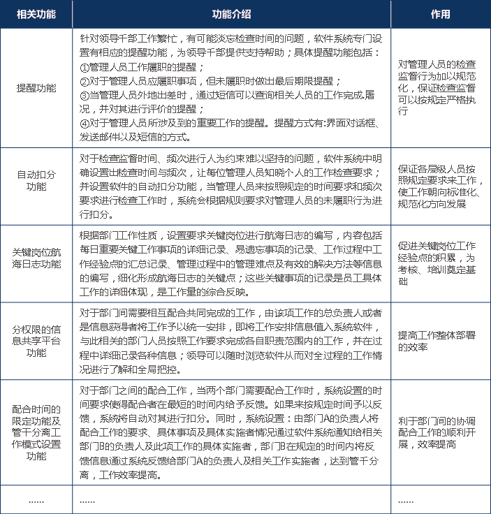 考核系统功能设计与考核方案密切相关,以方便客户管理和考核管控精细化为宗旨来进行系统功能的设置,实现过程管控的精细化。关于一些重点功能的展现,详见下表: