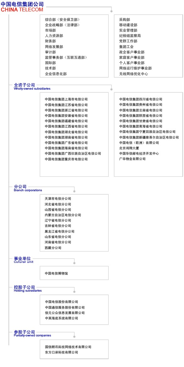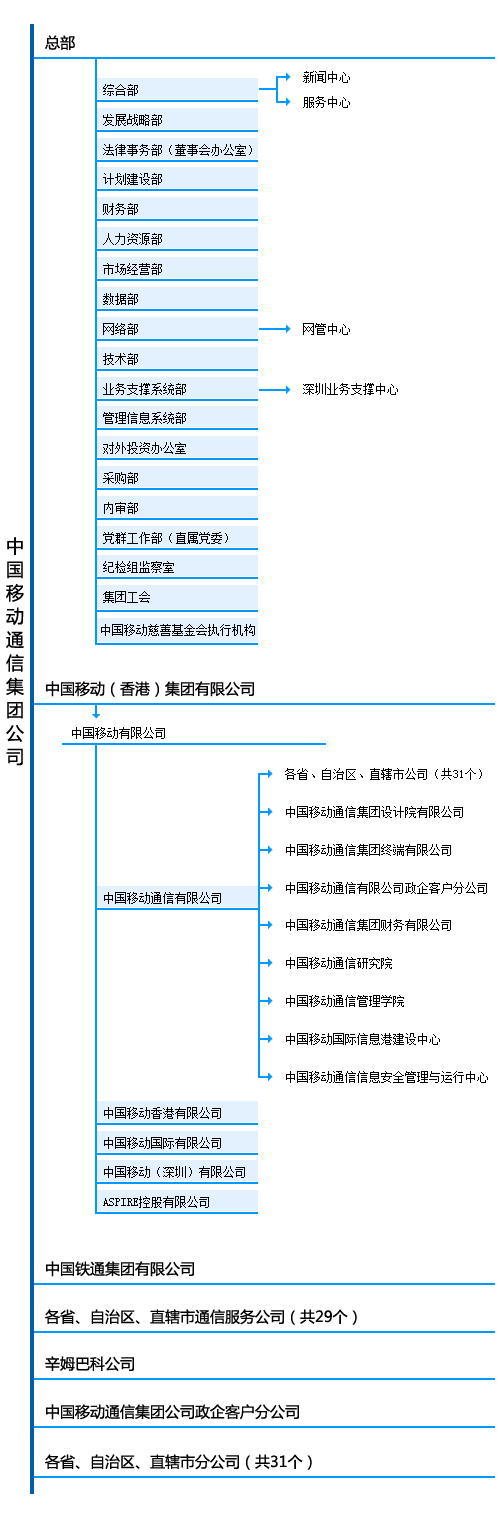 中国移动全资拥有中国移动(香港)集团有限公司,由其控股的中国移动有限公司,在国内31个省(自治区、直辖市)和香港特别行政区设立全资子公司,并在香港和纽约上市。从组织结构来看,中国移动属于高效的母子公司结构,集团本部由19个部门构成。近年来,中国移动通过全面推进战略转型,深入推动改革创新,加快转变方式、调整结构,经营发展整体态势良好,经营业绩保持稳定,并于2013年全新发布了商业主品牌“和”。