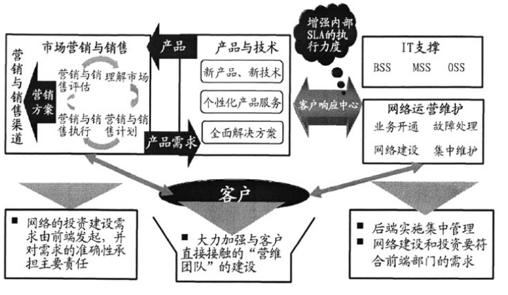 后端作为技术支撑部门,在进行网络建设和投资时要符合前端部门的需求,要以快速、准确响应前端为首要责任。同时注意产品技术开技、网络建没运维和IT支撑之间的协调,建立起信息通畅、响应迅速、服务高效、保障有力的电信网络运营支撑体系。