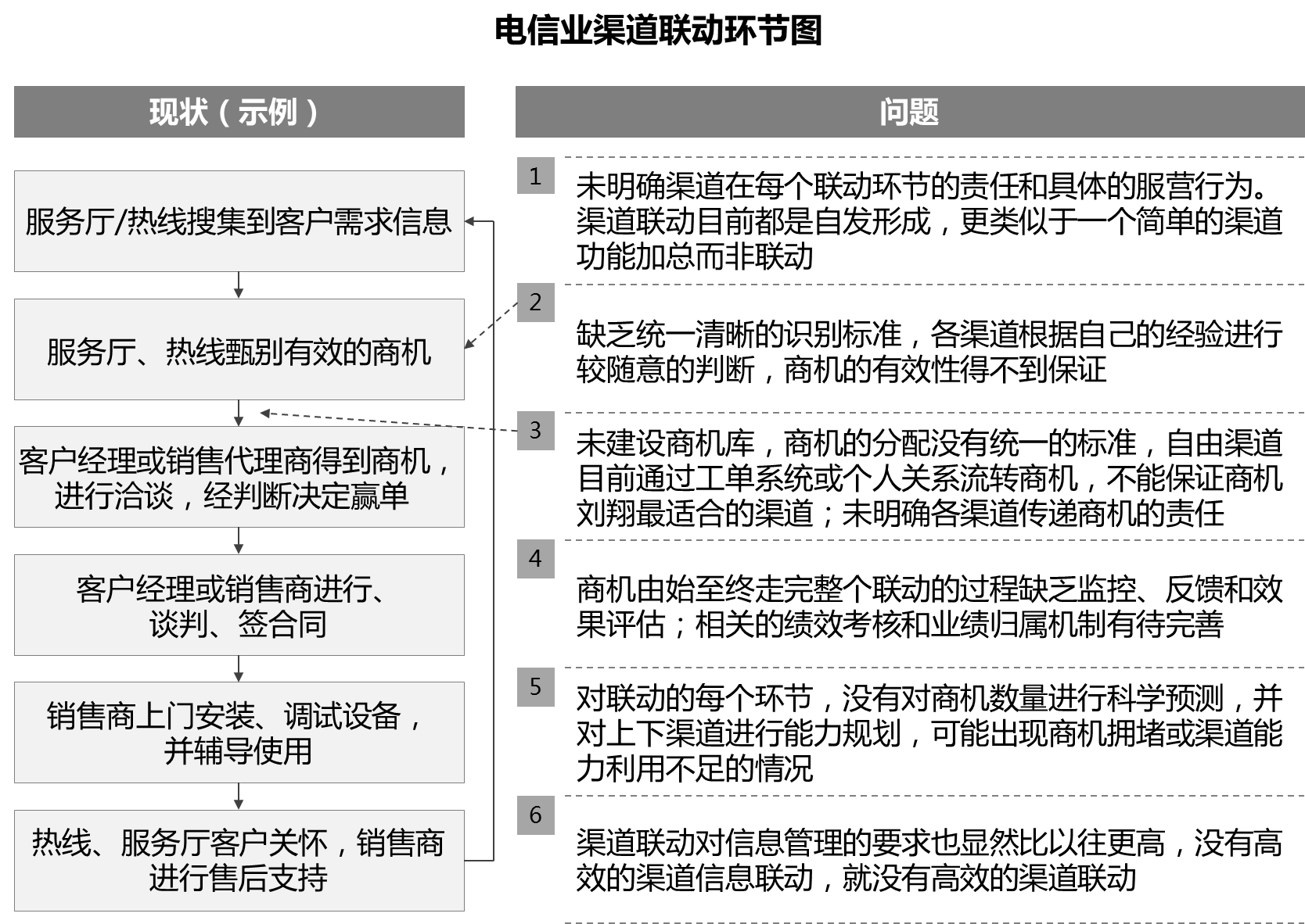 电信业各个渠道之间在联动环节中,没有明确指出各个部门的责任,对于商机缺乏统一清晰的识别标准,无法保证商机流向最适合的渠道,现有渠道无法发挥出最高效能。