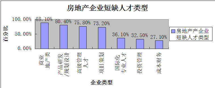调查研究表明:房地产企业的商业地产类、产品研发、规划设计、高级管理人才、项目策划、国际专业化人才、投资管理、成本财务的人才极度缺乏,尤其是房地产企业的商业地产类、产品研发、规划设计、高级管理人才,都在70%以上。