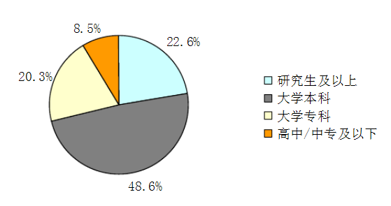 调查结果表明,我国房地产人员学历水平较高,大专学历及其学历以上占91.5%,其中大学专科占20.3%,大学本科占48.6%,为主要构成部分,但是研究生及以上的相对还是偏低,只占22.6%。
