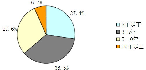 调研结果显示:中国房地产开发企业人员从业年限普遍较短。5年工作经验以下的占了63.7%,其中3年以下工作经验的占27.4%,3-5年工作经验的36.3%。但是,从业10年以上的员工只有6.7%,行业整体经验值较低。