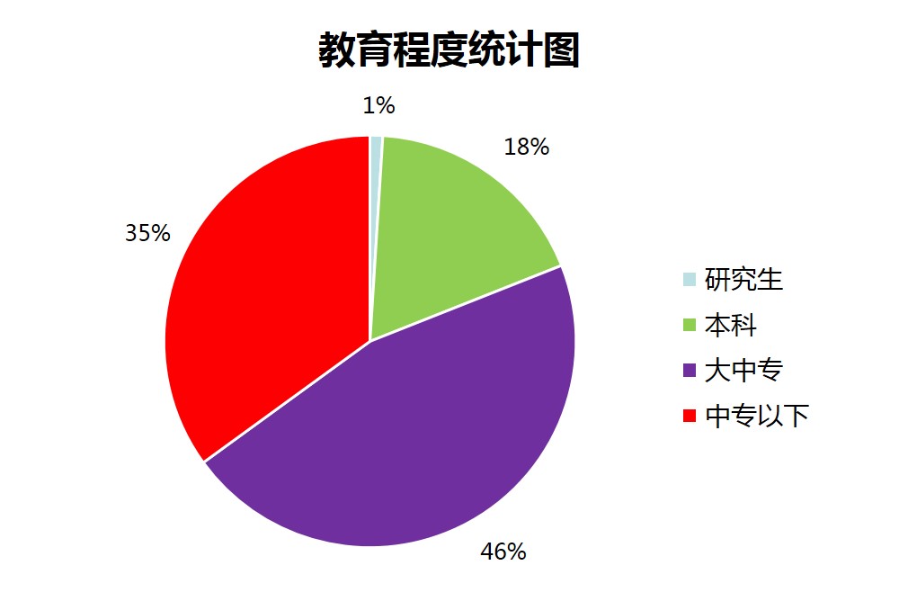 2、食品行业属于劳动密集型,食品饮料行业员工整体的教育水平偏低且人员工广域分布,信息共享难度大,增加了管理难度。左图为某大型国有食品集团教育程度统计表,由图可知,从业人员教育程度较低,中专以下学历占到35%,大中专学历占到46%,是食品从业人员的主体,大学本科学历仅占到18%,研究生仅占到1%。右图为国内某中型食品集团教育分布图,由图可知,2013年中专及中专以下学历占到60%,大专学历占到29。4%,大学学历占到10.96%,研究生学历仅占到0.65%。中专以下人才是食品饮料行业的人员主体,而本科及以上学历无论是在大型国企还是发展迅速的民营企业均不足20%,