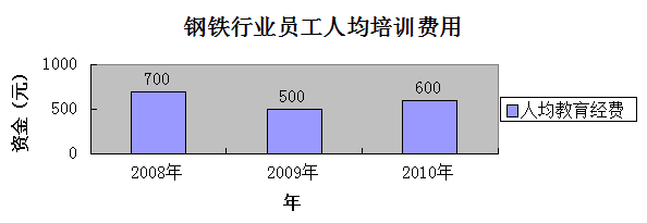 根据相关数据分析:我国2010年金融行业人均年培训费用是2400元,制造业人均年培训费用是1019元,传统服务业年培训费用是897元。钢铁行业员工培训费用相对其他行业的人均培训费用偏低。2008年钢铁行业员工人均培训费用是700元,由于金融危机,企业为了降低人工成本,减少员工的培训费用,员工人均培训费用为500元。2010年,随着钢铁行业效益稍微回暖,员工培训费用增长到600元,但是还是低于金融危机前的水平。