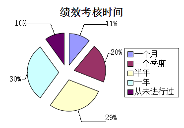 大部分酒店企业都对酒店员工进行绩效考核,极少部分酒店企业对员工的考核时间是一个月一考核,只占11%。一个季度一考核占20%。酒店企业对员工考核的时间主要集中在半年或者一年一次,分别占29%、30%。