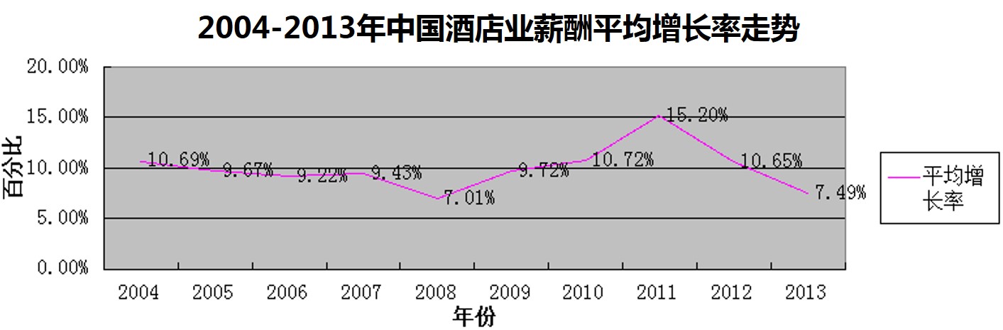 根据酒店行业薪酬调研数据显示:2004年-2008年,酒店薪酬平均增长率趋于平稳,在9.2%左右徘徊。2008年-2011年,我国酒店业性质呈上升趋势,2011年,酒店业薪酬平均增长率达到15.20%。自2011年以来酒店业薪酬的呈持续下降的态势。2013年度酒店平均增长率为7.49%,较2012年薪酬平均增长率出现小幅的下降。
