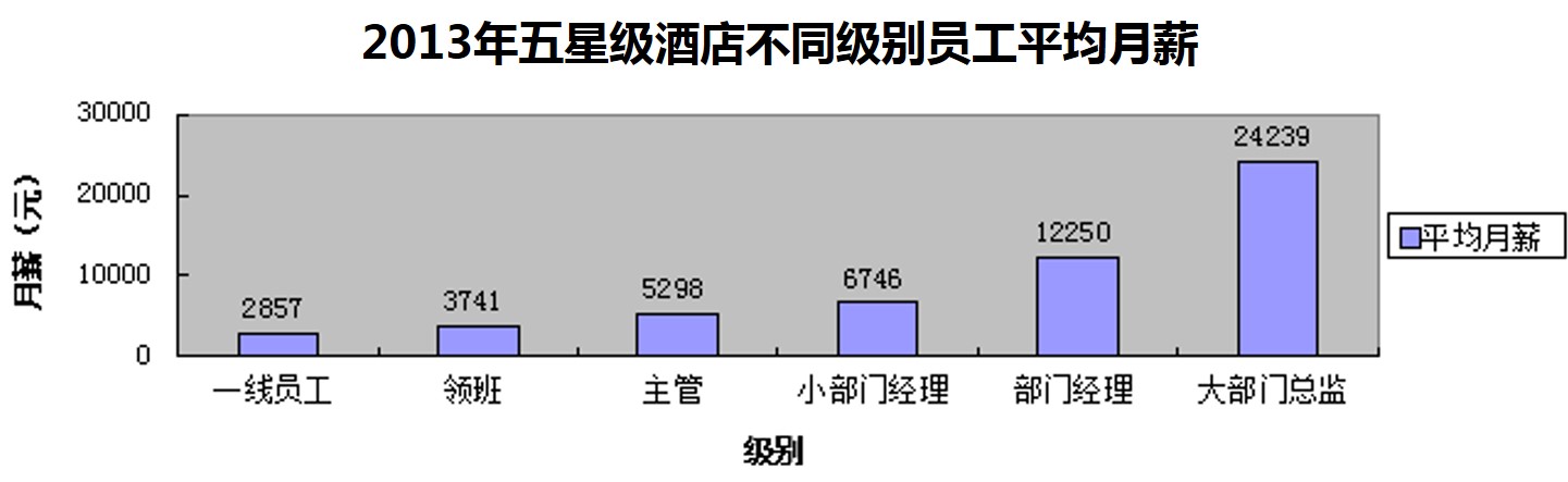 根据2013年五星级酒店不同级别员工平均工资显示:五星级酒店大部门总监平均薪酬达到24239元,部门经理为12250元,小部门经理为6746元,主管为5298元,领班为3741元,一线员工为2857元。员工工资呈阶梯分布,级别越高,薪酬也越高。