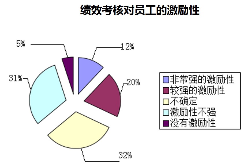 大部分人认为绩效考核对员工具有激励作用,只有5%的人认为绩效考核对员工是没有激励作用的。12%的人认为绩效考核对员工有非常强的激励性作用;20%的人认为绩效考核对员工有较强的激励性作用;32%的认为是不确定的;31%人认为激励作用相对不强。这说明绩效考核在一定程度上可以督促员工的工作,增加员工的工作积极性。但是绩效考核方面仍然存在一些缺陷,需要进一步改进。
