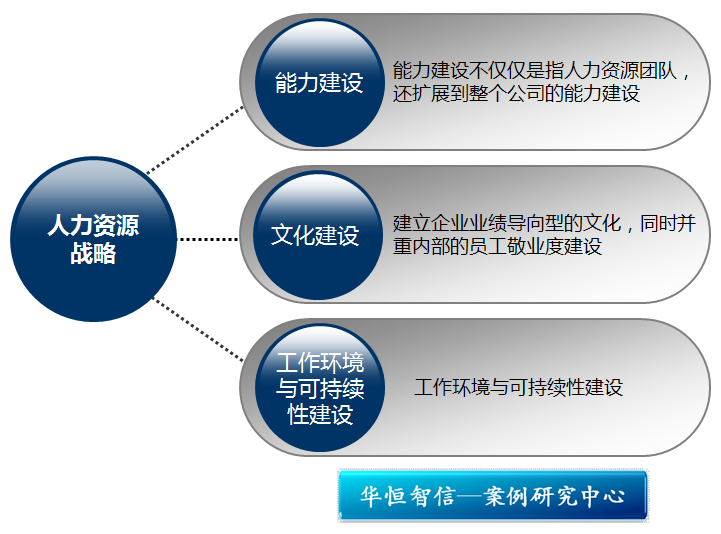 这三部分是一个有机的整体。在任何变革面前,人们首先会关心公司的整体目标是什么;其次是如何衡量这些目标的达成;再次是如何执行,有哪些支柱去支撑这一战略。当然,在这三大支柱下仍有更加具体的细分,如能力建设方面,包括如何更好的通过市场找到合适的候选人、如何在内部发展培养人才、怎样制定更好的接任者计划;企业文化层面,怎样去驱动公司的业绩导向文化、怎样制定企业内部上下一致的原则,从而帮助员工在企业扎根……