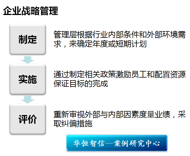 企业战略管理分为三部分:战略的制定、实施和评价。企业战略的制定首先需要管理层根据行业内部条件和外部环境需求,来确定年度或短期计划的。案例中阿迪达斯就是根据外部环境的变化,感受到机会与危险,分析其内部环境,重新调整了以往的战略。战略的制定不是盲目的,不仅要物资跟上,人力资源配置也要充分考虑。战略的实施体现在工作中就是通过制定相关政策激励员工和配置资源保证目标的完成。战略评价是重新审视外部与内部因素度量业绩,采取纠偏措施。化解到具体工作,就是人事部门将工作目标量化、激励员工完成。