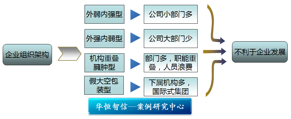 机构重叠臃肿型——部门多,职能重叠,人员浪费。这种现象,往往是企业发展到了一定程度从而形成的。管理人员偏多,各种关系错综复杂,裁员都无法下手,没有办法就只有另设立机构。从而造成企业的臃肿现象。如奥X公司,年销量超过十亿元,下属八大中心,其中最强势的是营销中心,可是,公司又设立了一个企划中心,两个是平级的。按照常理来说,营销中心一般包括了策划与销售两个职能。就没有必要再设立一个平级的企划中心了。而这个公司的营销中心,除了不开发产品外,其它的策划都在做。企划中心做的方案,到了营销中心,往往被枪毙了。还有个公司,同时有两个设计部。功能没有划分,往往让下单及跟单人员都累得“不亦乐乎".