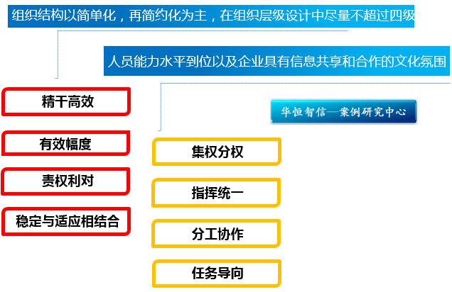 华恒智信认为,高效组织结构设计首要的目标是“迅速实现扁平化,以提高运营效率和实现组织能力的提升”,为了实现这样的目标需要有两个手段来保证。
